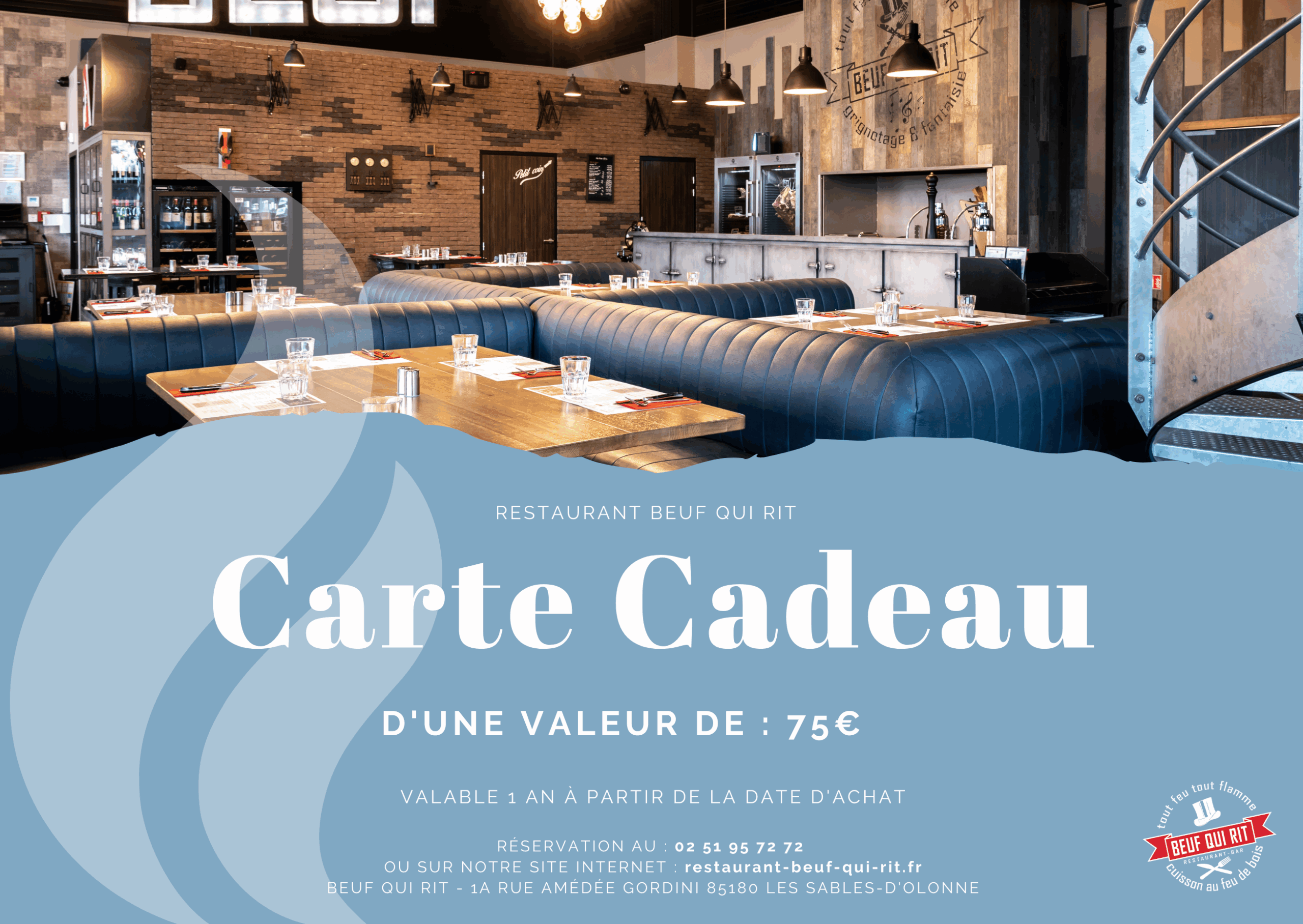 Offrez un moment de pur plaisir à vos proches, avec une carte cadeau de 75 € à dépenser dans votre restaurant Beuf Qui Rit.